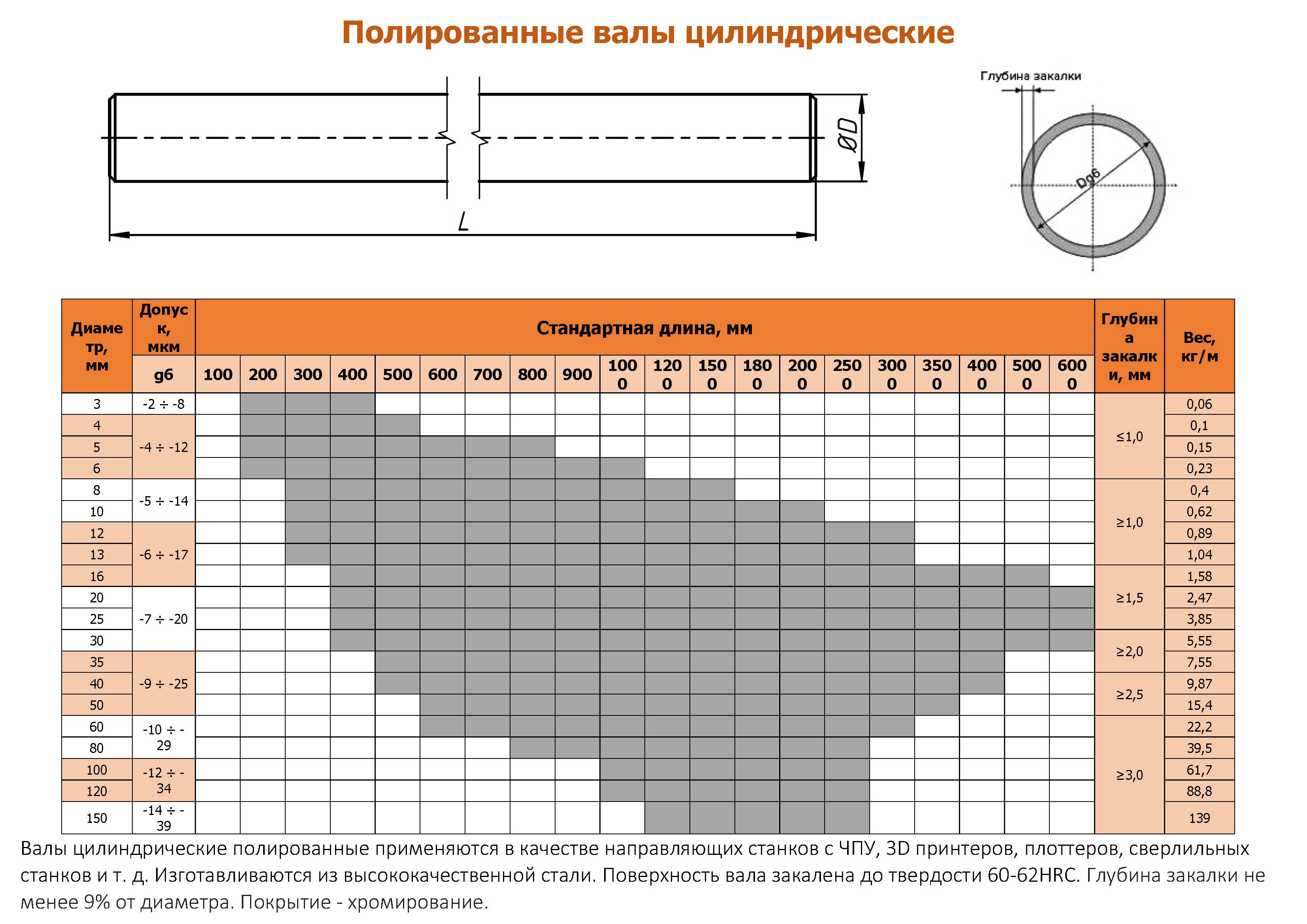 Валы цилиндрические полированные применяются в качестве направляющих станков c ЧПУ, 3D принтеров, плоттеров, сверлильных станков и т. д. Изготавливаются из высококачественной стали. Поверхность вала закалена до твердости 60-62HRC.
