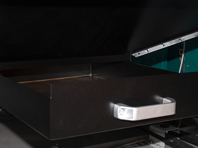 Под рабочим столом расположен лоток для сбора обрезков и отходов, который легко извлекается и чистится. Это улучшает эргономику работы и упрощает обслуживание станка.