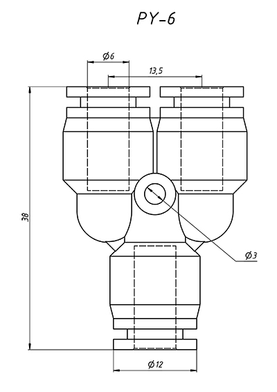 Фитинг Y-образный PY-6 - соединительный элемент для пневматических трубок наружного диаметра 6 мм. Устанавливается в местах разветвления пневматических систем.