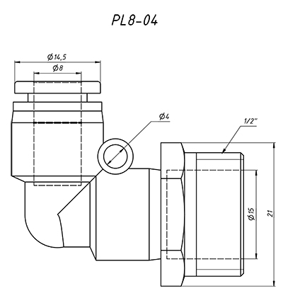 Фитинг Г-образный с наружной резьбой 1/2". Соединительный элемент для пневматических трубок наружного диаметра 8 мм. Устанавливается в местах соединения пневматических систем.