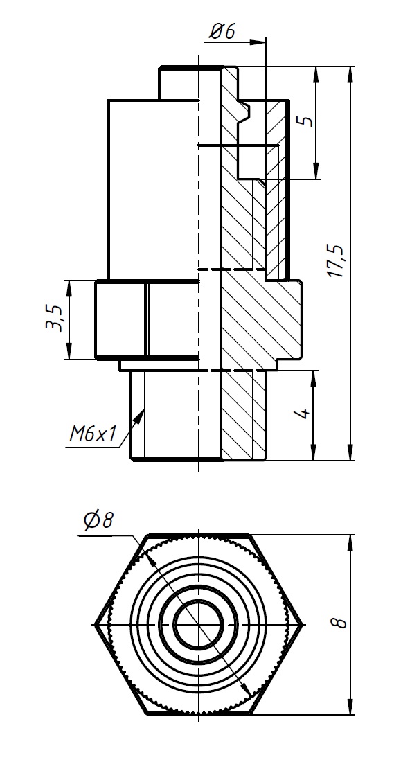 Фитинг прямой шестигранный с резьбой M6. Соединительный элемент для трубок наружного диаметра 6 мм. Устанавливается в местах соединения пневматических систем и систем централизованной смазки.