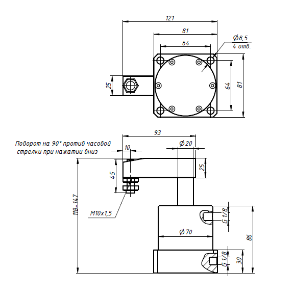 Пневматический зажимной цилиндр ACKL63X90, c одинарным поворотом, двойного действия: нажимной и поворотный (влево).