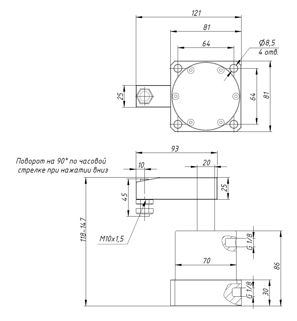 Пневматический зажимной цилиндр ACKR63X90, c одинарным поворотом, двойного действия: нажимной и поворотный (вправо).