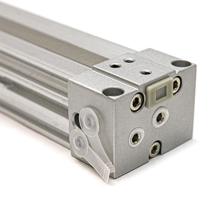 Бесштоковые цилиндры выполняют функцию линейного пневматического привода. Они отличаются от стандартных цилиндров тем, что у них отсутствует шток и для передачи движения служит каретка, которая перемещается вдоль профиля цилиндра, что легко позволяет обеспечить гораздо больший ход.