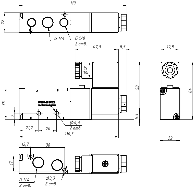 Пневмораспределитель 4V210-08 с 1 катушкой управления служит для управления направлением движения потоков сжатого воздуха. Управление осуществляется за счет переключения схемы соединения внутренних каналов распределителя с входными и выходными присоединительными отверстиями.
