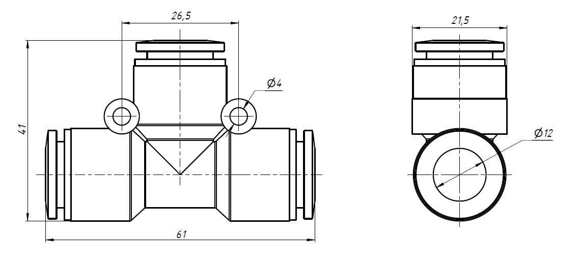 Фитинг Т-образный APЕ-12 - соединительный элемент для пневматических трубок наружного диаметра 12 мм. Устанавливается в местах разветвления пневматических систем.