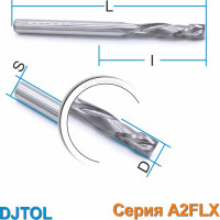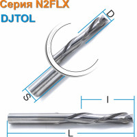 Фрезы компрессионные двухзаходные DJTOL 2FLX. Применяются для чистовой обработки по деревянным материалам, в частности, по ламинированным древесно-стружечным плитам (ЛДСП). Благодаря особенной геометрии, компрессионные фрезы не приводят к образованию сколов на верхней и нижней гранях обрабатываемого материала.