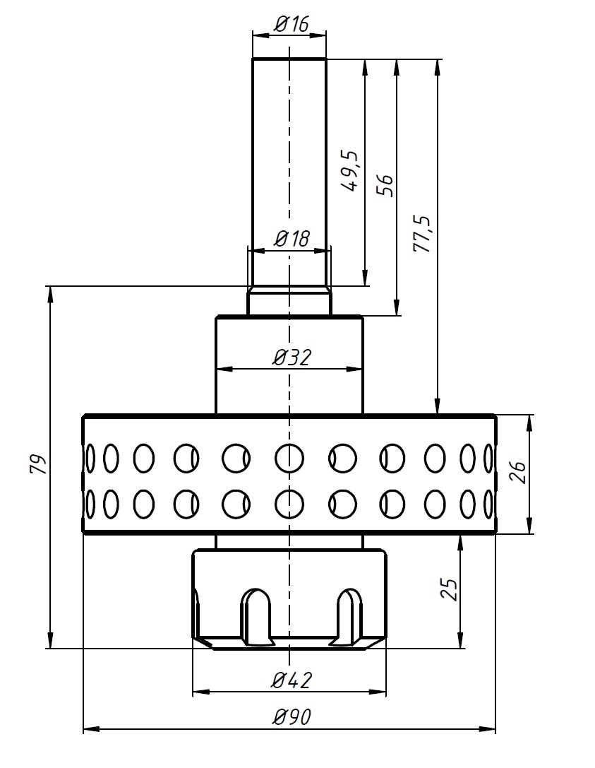 Патрон термосверления оснащен системой охлаждения в виде алюминиевого барабана, который необходим для рассеивания тепла. Зажим – цанговый ER25-UM, хвостовик имеет диаметр 16 мм.