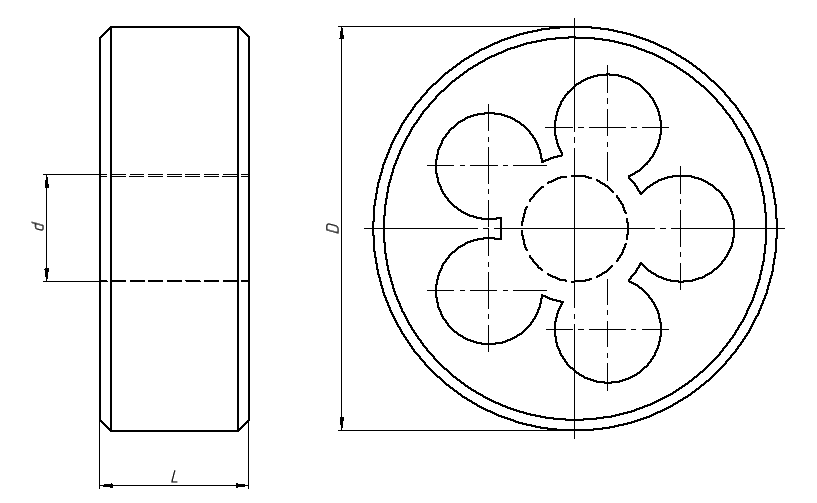 Материал плашки − быстрорежущая сталь HSS (Р6М5 − вольфрам 6%, молибден 5%). Отличная стойкость к износу и повреждениям.