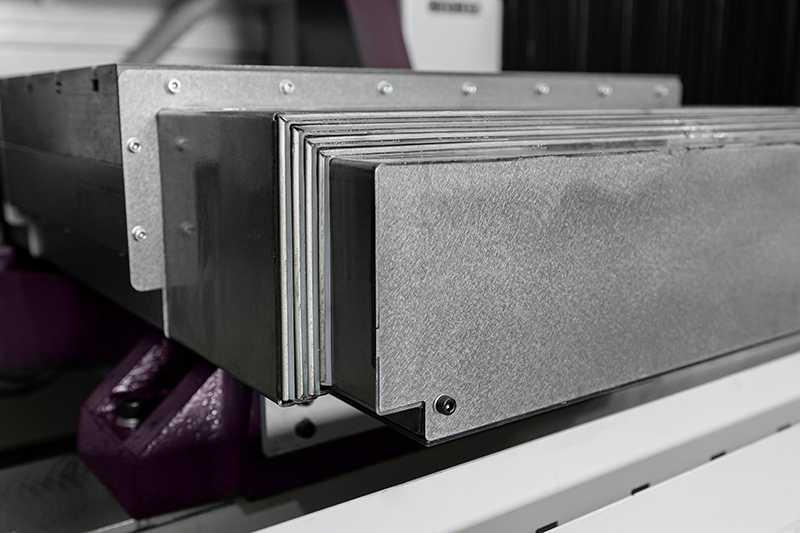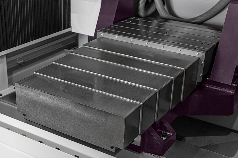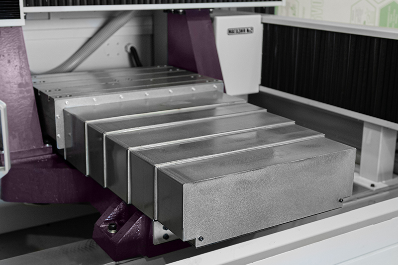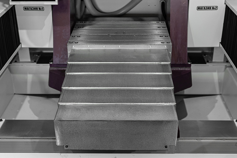 Телескопическая защита состоит из нескольких подвижных секций, которые плавно складываются и раскладываются при движении узла станка.